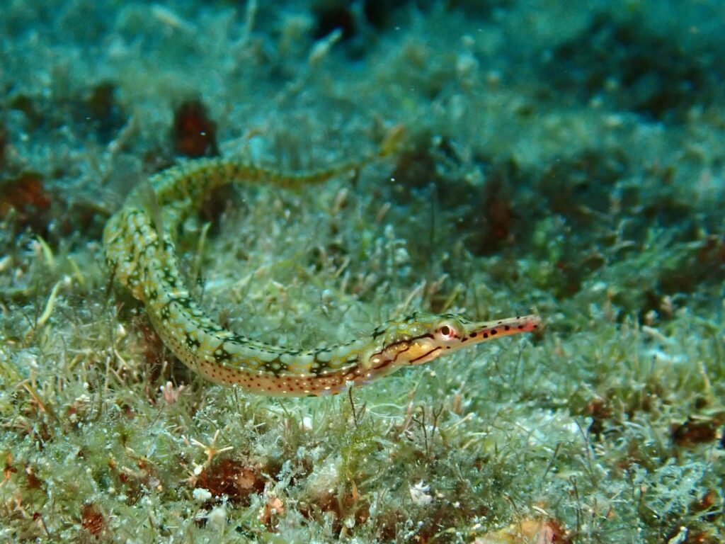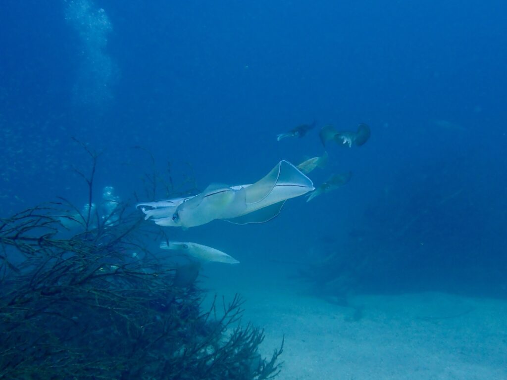 サンセットダイブでは、日中よりも心なしか魚との距離感が近い気がしますね。運が良ければ産卵行動が観察できることも!